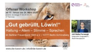 Offener Workshop „Gut gebrüllt, Löwin!“: Haltung – Atem – Stimme – Sprechen, ab 13. Januar bis 24. März 2026, mit Heike Forwergk