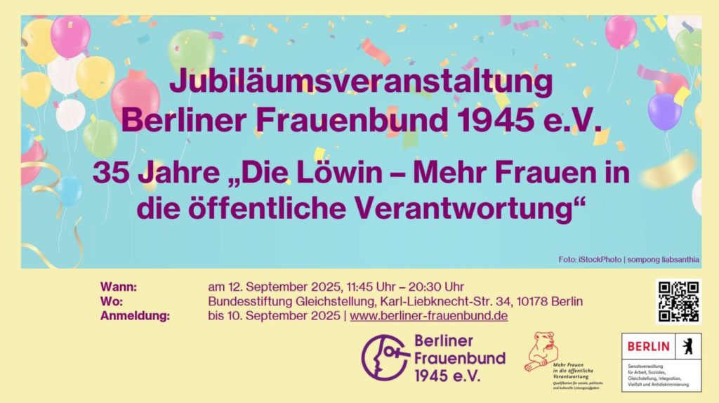 - Jubiläumsfest des Berliner Frauenbundes 1945 e. V. 35 Jahre „Die Löwin“ am 12. September 2025 in der Bundesstiftung Gleichstellung (Veranstaltungsseite)